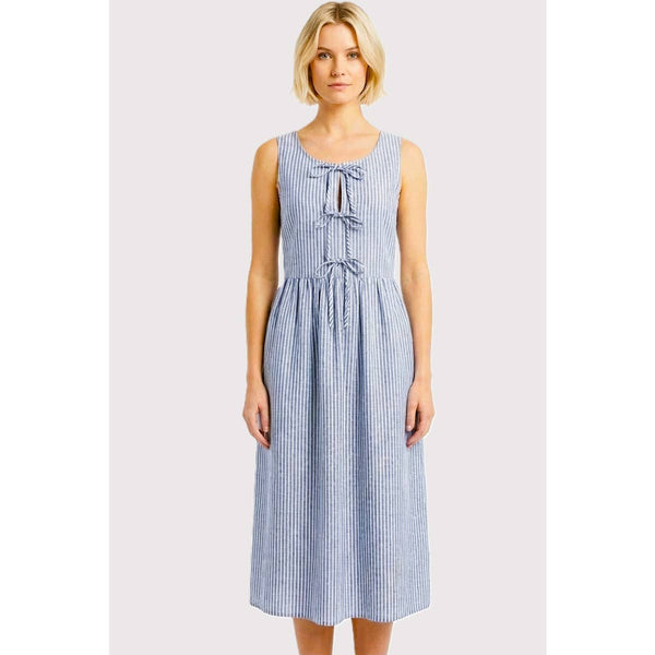 The Celestine Pinstripe Bow Midi Dress: Denim Blue – Sleeveless Keyhole Tie Neck Dress