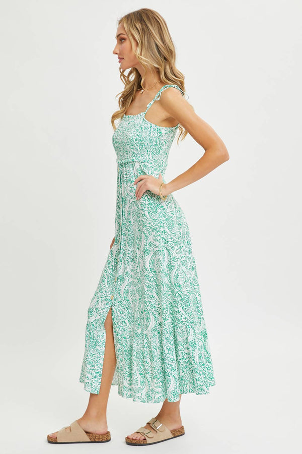 The Seraphina Floral Paisley Midi Dress: Green – Smocked Bodice Button Detail Dress