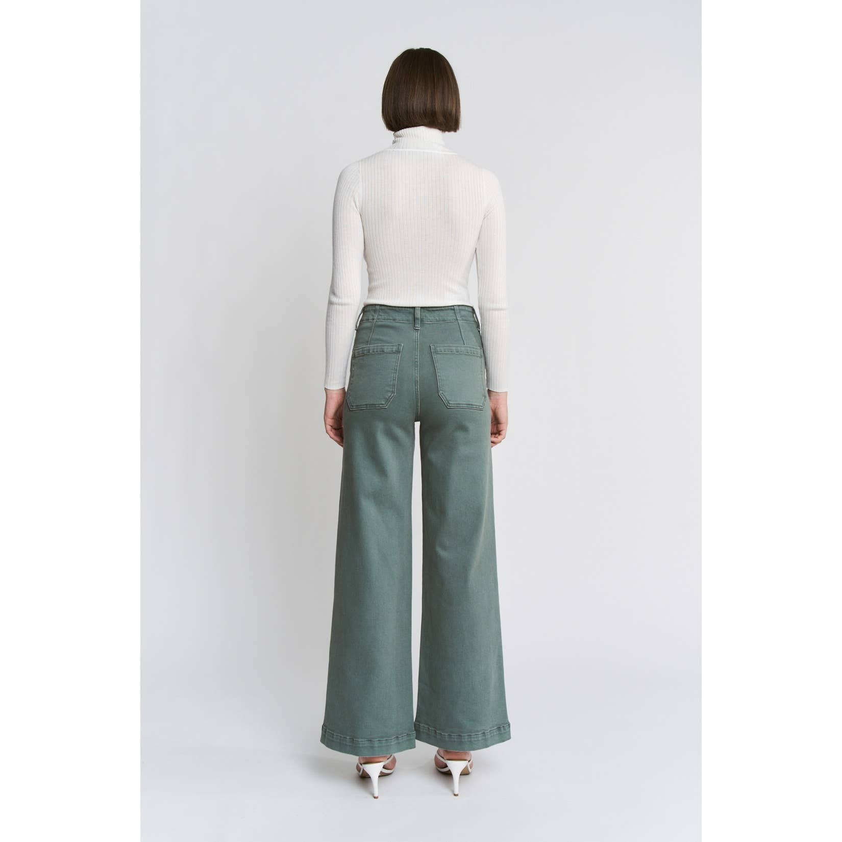 Step into effortless sophistication with the Remi High Rise Wide Leg Jeans, the perfect mix of structure and stretch. Designed in a soft sage green hue with a flattering high-rise waist, these jeans bring a fresh, modern twist to a vintage-inspired silhouette. The wide leg cut elongates your figure while front patch pockets add a subtle retro touch. Crafted from a comfortable cotton-blend denim, they move with you—whether you're styling them for the office, a fall outing, or a weekend brunch.