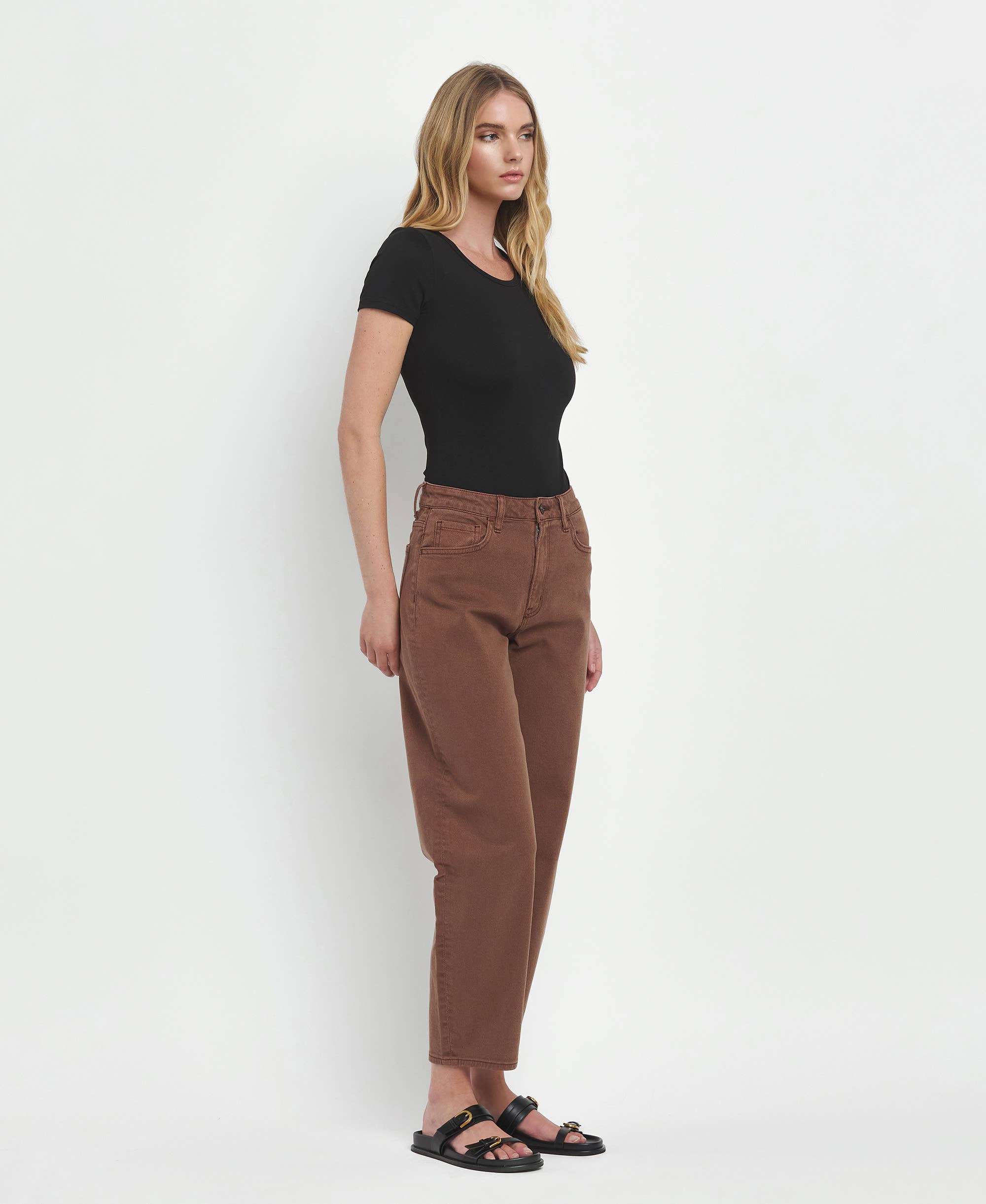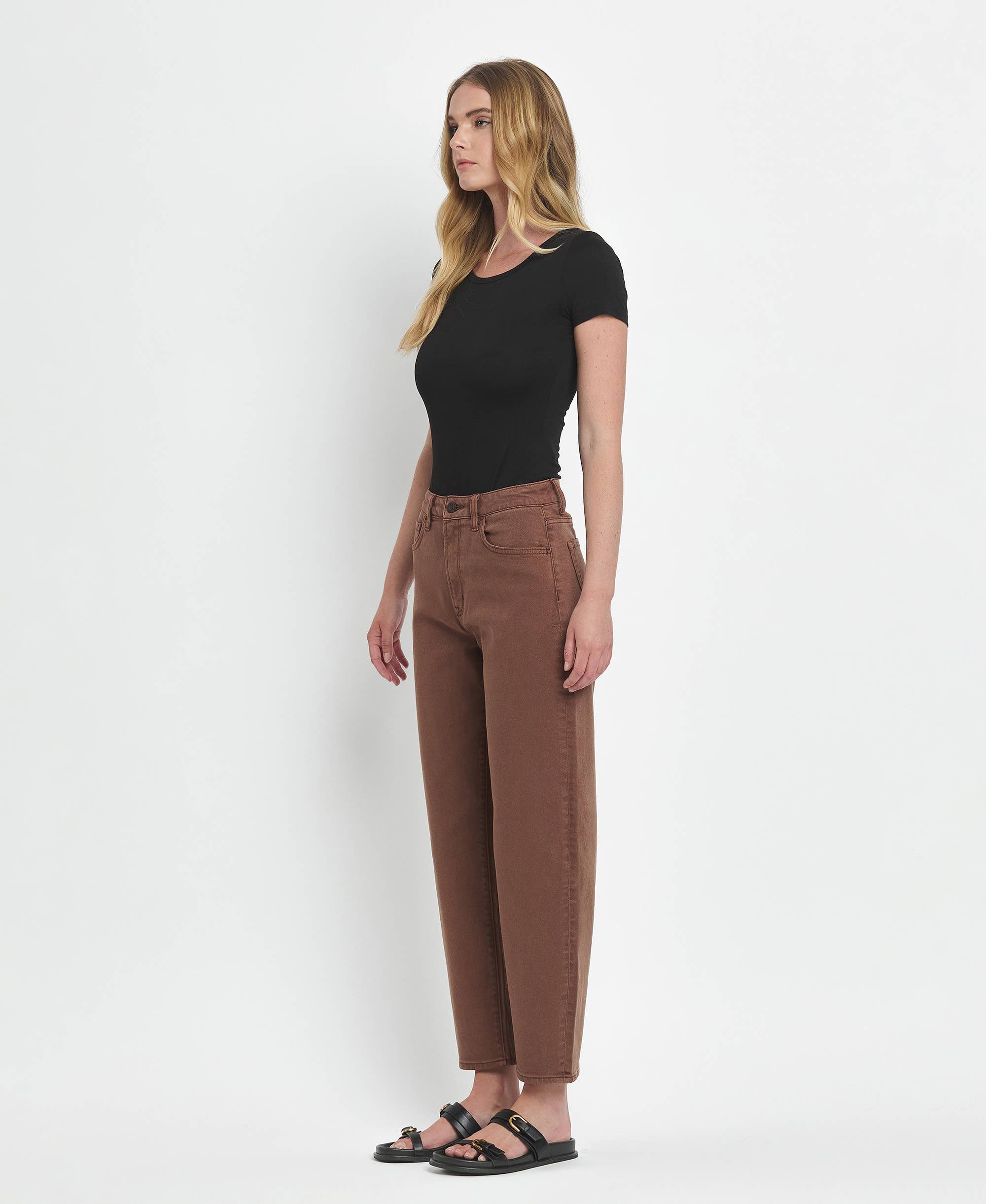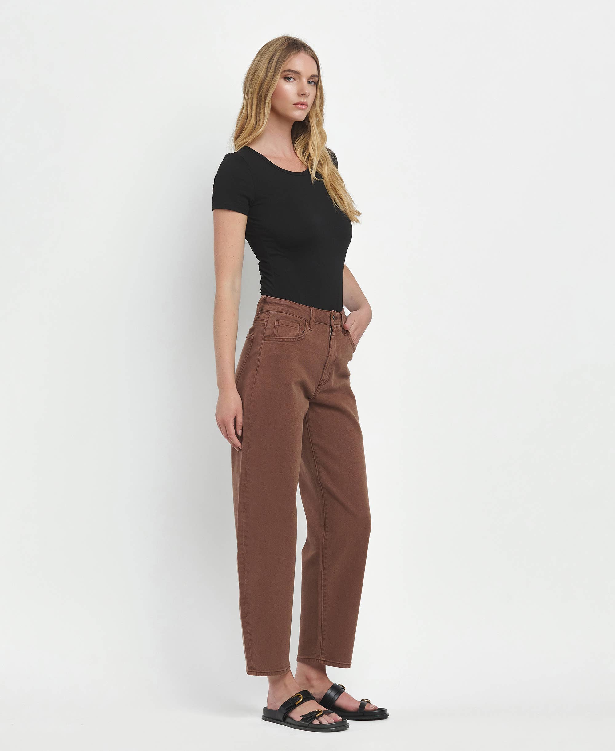 Meet your new fall favorite denim — the Kate Slim Barrel Jeans in a rich mocha brown wash. Designed with a flattering super high rise and a modern cropped barrel-leg silhouette, these jeans blend structure with comfort thanks to their soft, stretch denim. The earthy tone pairs effortlessly with cozy sweaters, plaid shackets, and boots — perfect for that lived-in Midwest look.