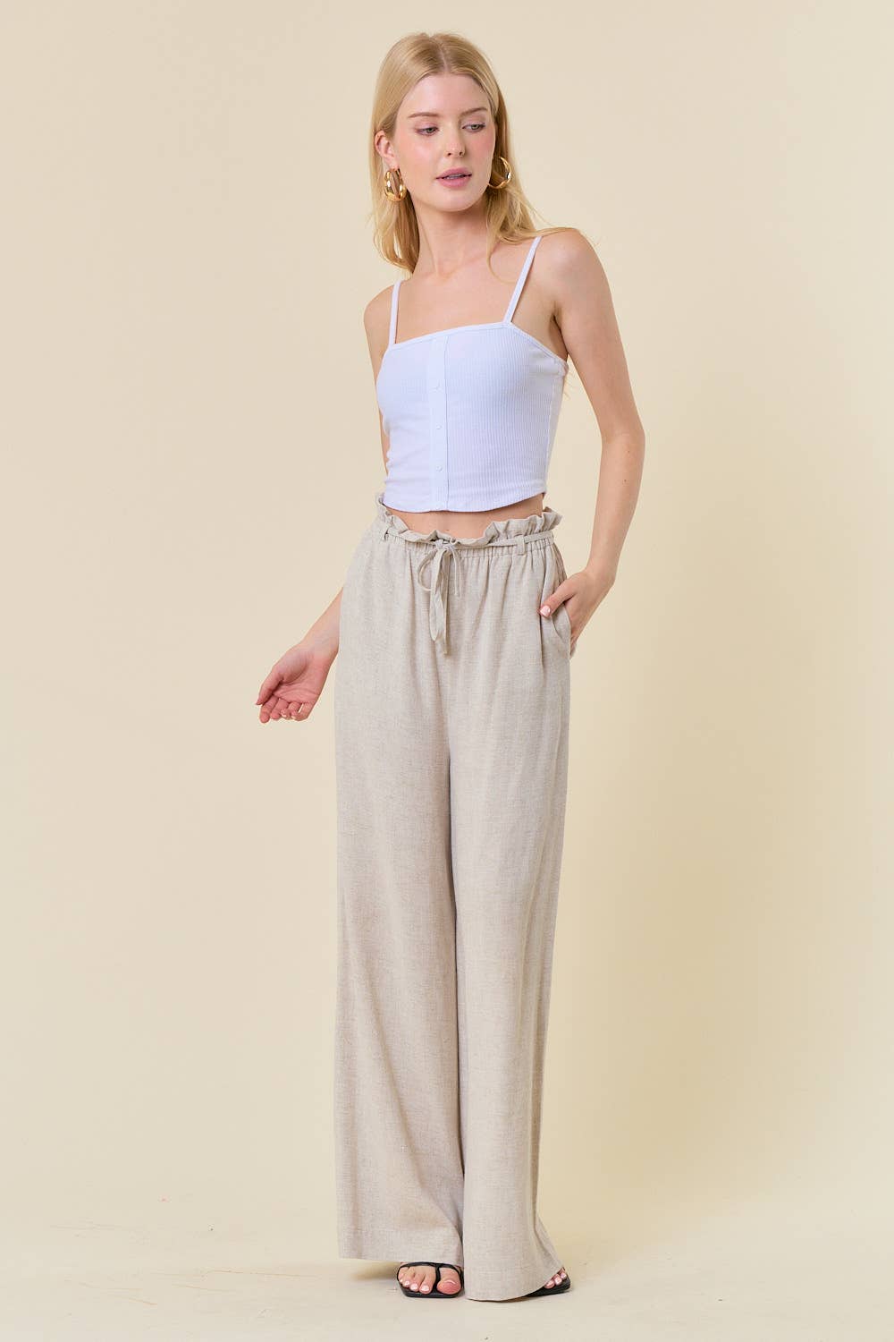 The perfect summer essential - our Joan Linen Paper Bag Wide Leg Pants. With casual and beachy vibes, these pants are perfect for spring and summer. The wide leg style and lightweight linen material make them comfortable and stylish. A must-have for any warm weather wardrobe!