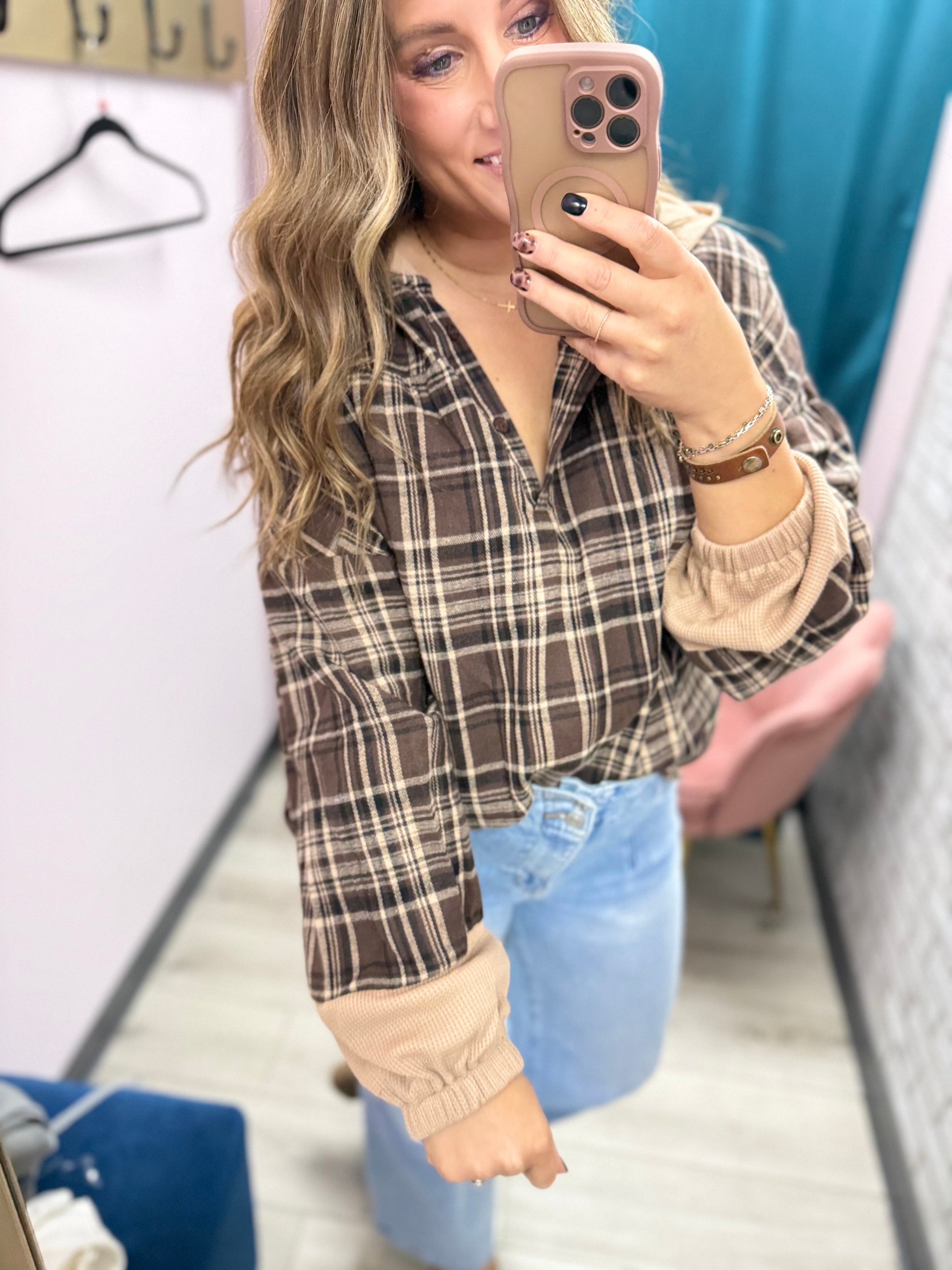 The Bristol Plaid Hooded Popover brings a cozy, lived-in feel to your fall wardrobe. With its warm chestnut plaid, contrasting corded hood, and gathered sleeves, this top blends small-town charm with laid-back comfort. It’s the perfect throw-on style for pumpkin patch afternoons, holiday errands, or a weekend at the cabin.