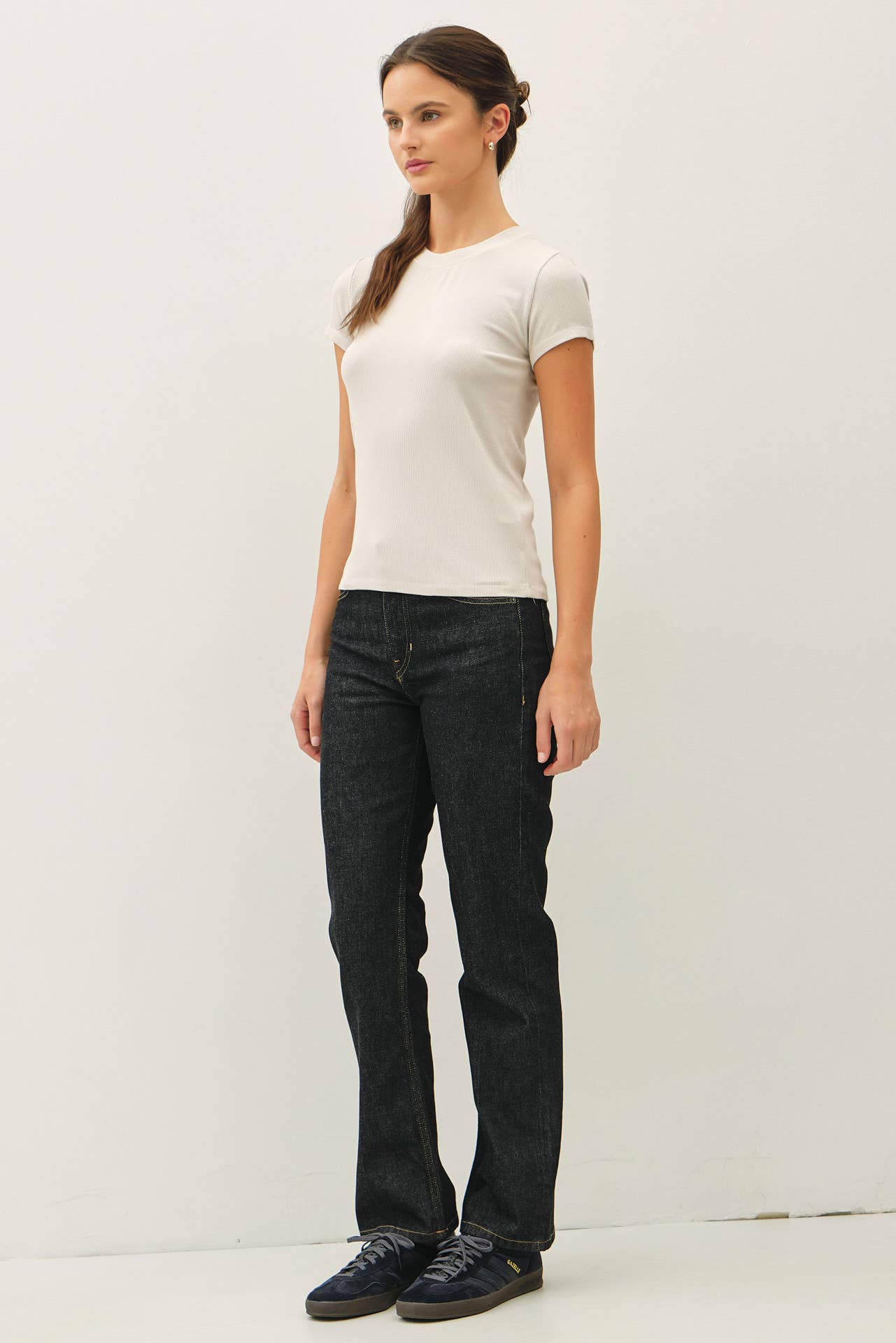 Tuck into high-rise denim with a belt for a structured everyday look.