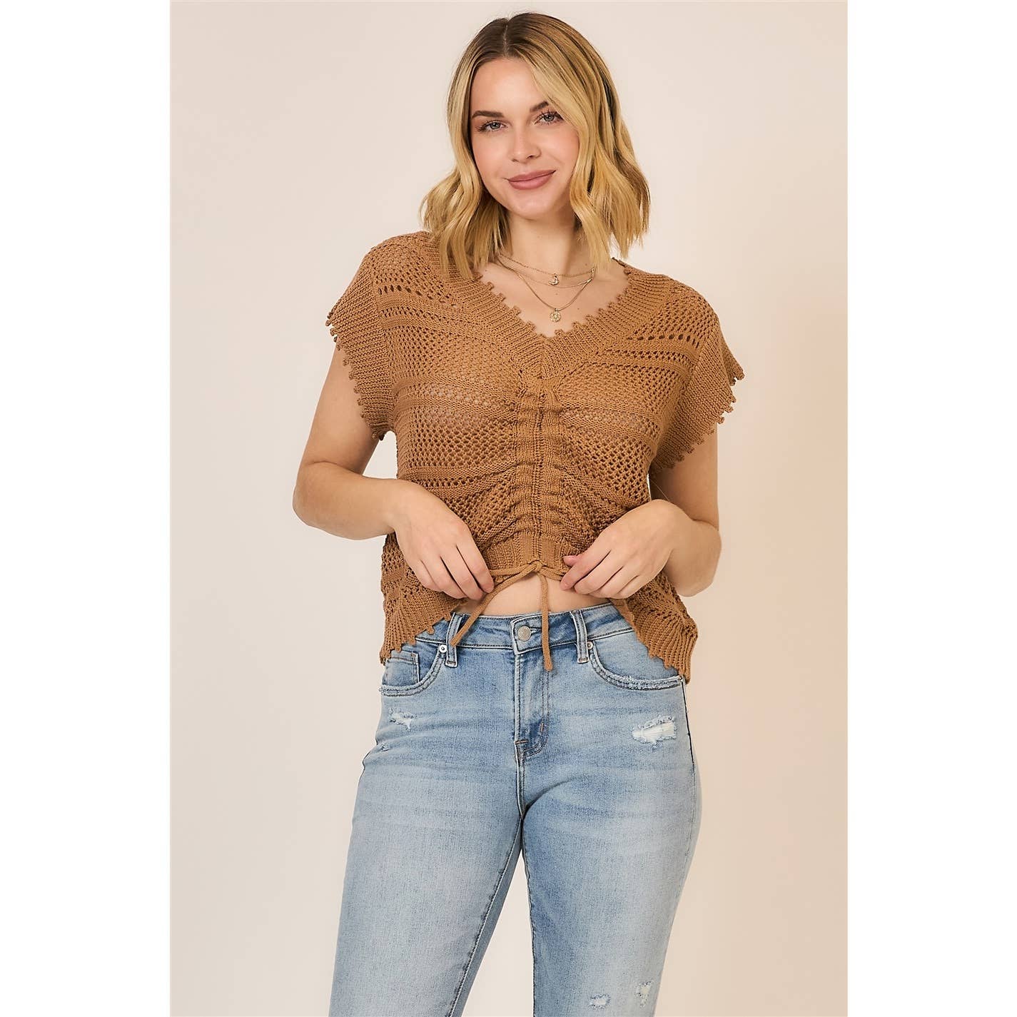 The Ava Ruched Knit Top features an airy open-knit design with a functional center cinch that creates a customizable ruched silhouette. The soft V neckline enhances the neckline without feeling too low, while the adjustable center detail lets you control how fitted or relaxed you want the look.