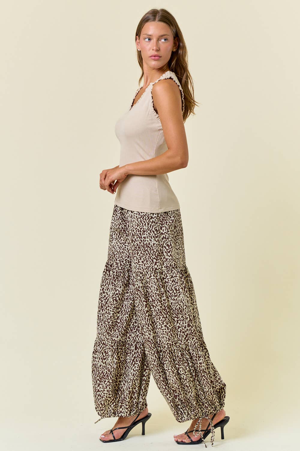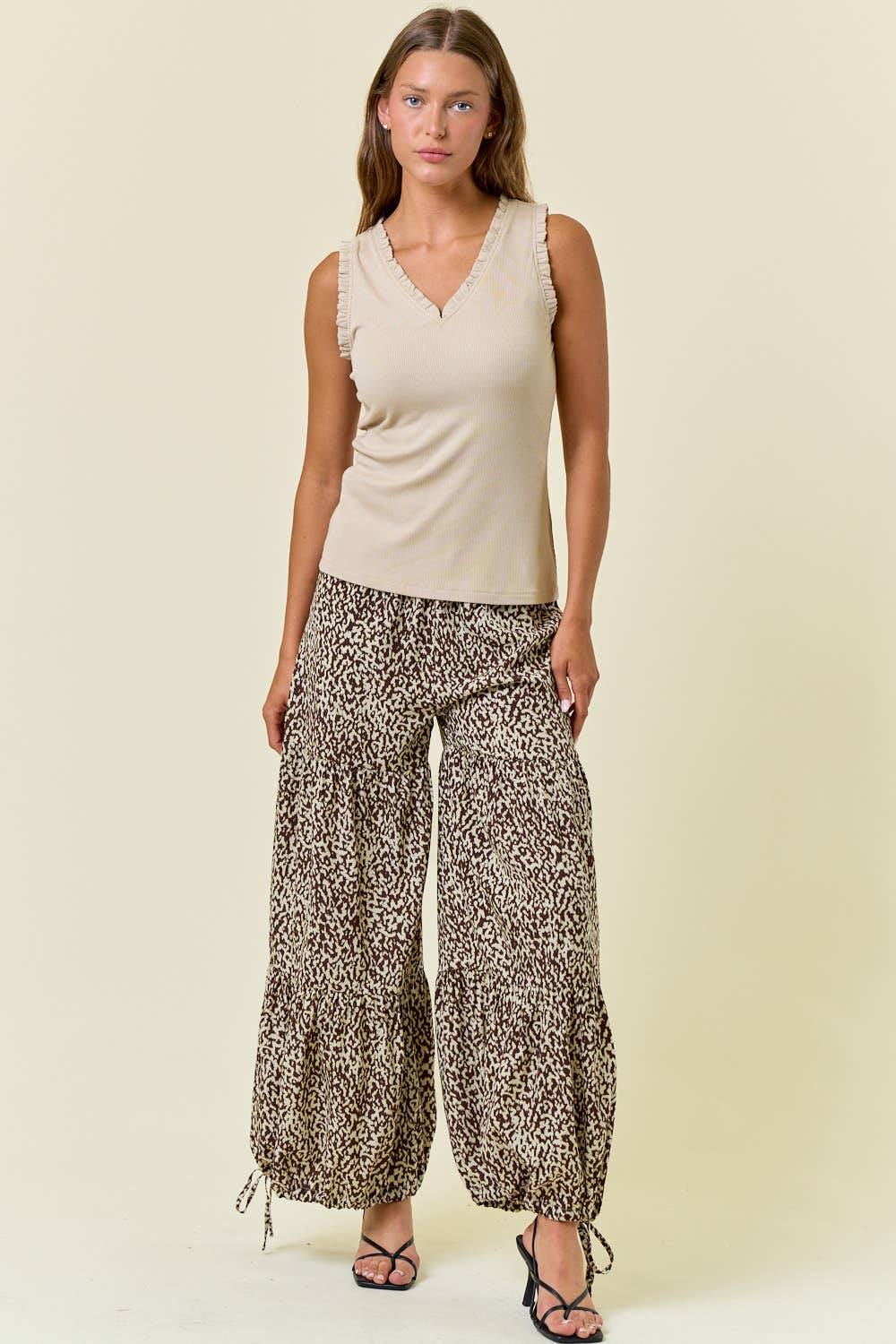 The Alessia V-Neck Frill Trim Knit Tank is a feminine everyday essential designed for effortless layering. Crafted from a soft ribbed knit fabric with comfortable stretch, this sleeveless top features a flattering V-neckline and delicate frill trim detailing along the neckline and armholes. The slightly fitted silhouette makes it perfect for wearing on its own or styled under jackets, cardigans, and blazers. Lightweight, versatile, and easy to dress up or down, Alessia is a must-have boutique staple for year-round wear.