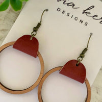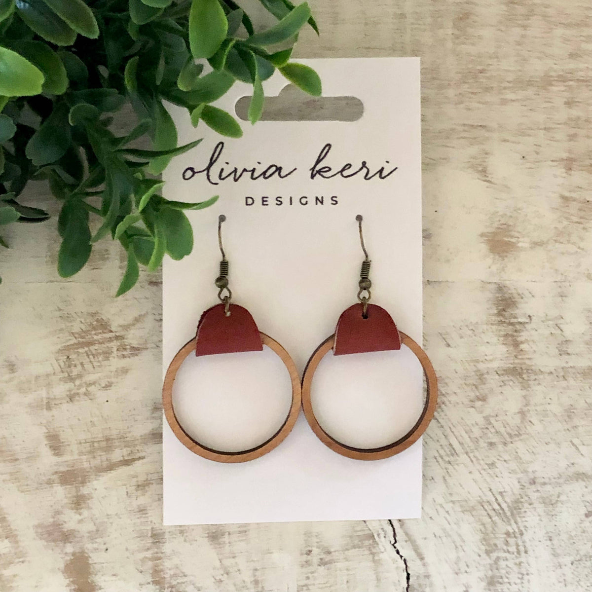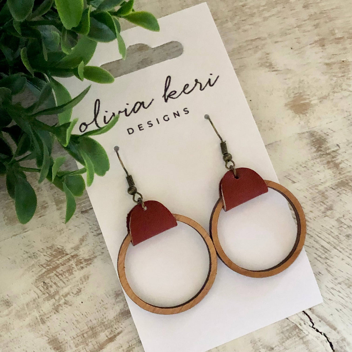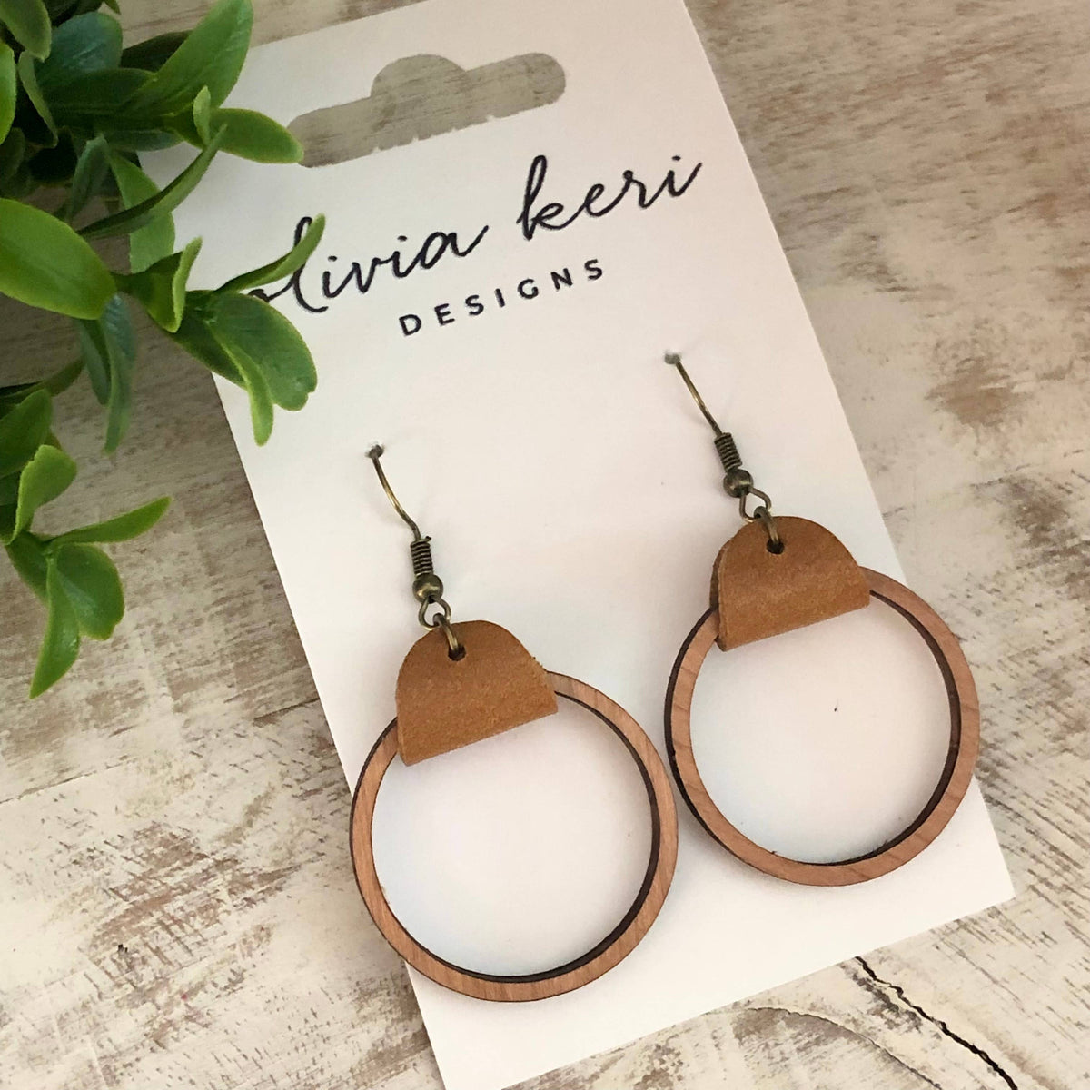 Add a touch of rustic charm to your accessory game with these handcrafted Cherry Wood & Leather Hoop Earrings by Olivia Keri Designs. Each pair features a warm cherry wood circle accented with a soft neutral leather tab in your choice of black, rust, or camel. Designed with lightweight comfort in mind, these earrings are finished with antique bronze nickel-free hooks and include rubber backings for secure wear.