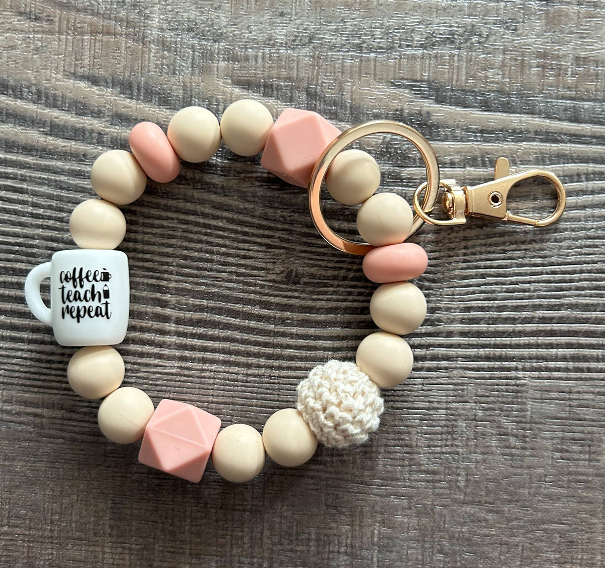 Introducing our Coffee Teach Repeat Wood and Silicone Beaded Wristlet Keychain – the perfect accessory for educators and coffee lovers alike!