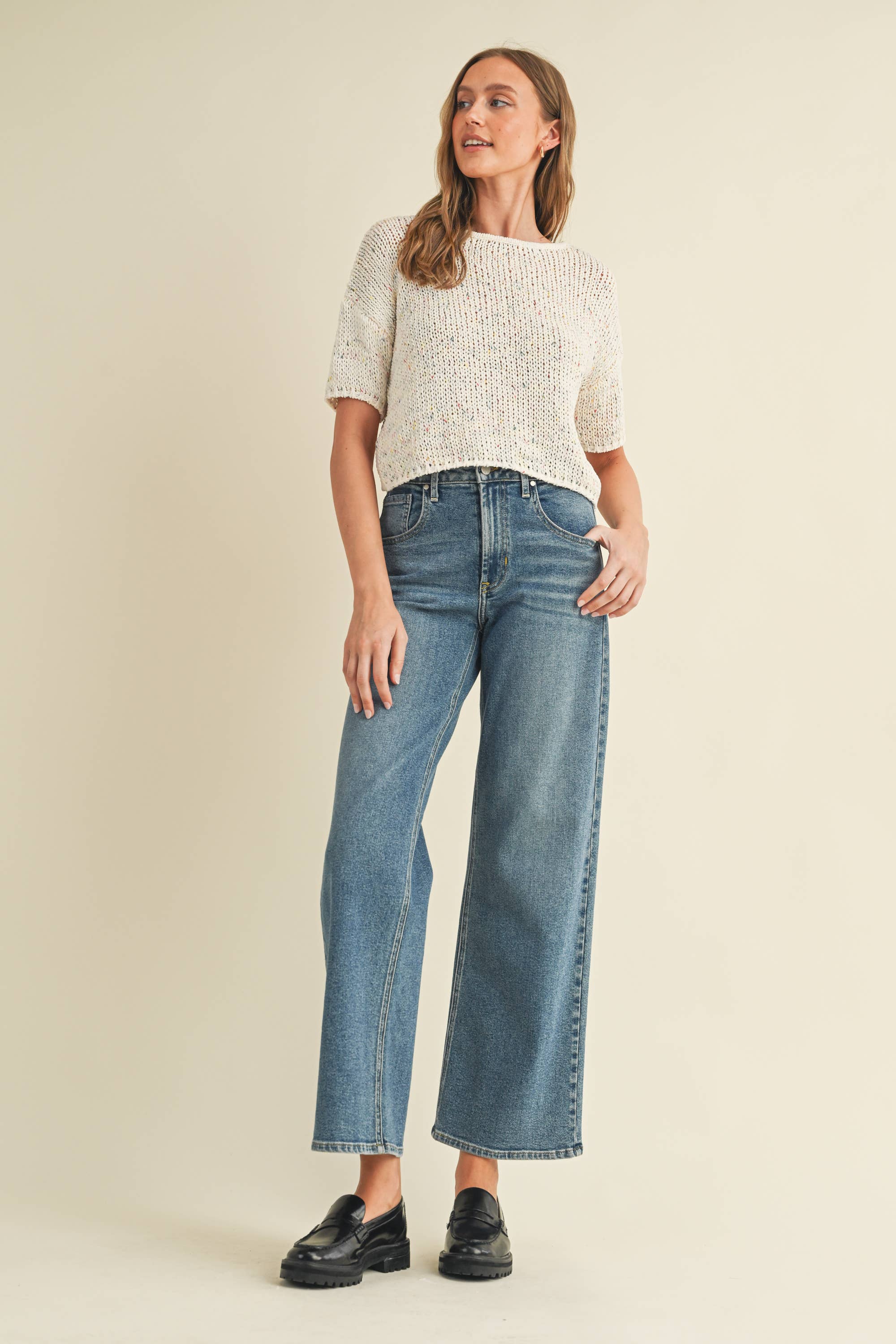 Add a playful pop of color to your everyday wardrobe with the Harper Confetti Sweater. This soft knit sweater features a fun multi-color confetti pattern woven throughout, giving it a cheerful and unique boutique feel.