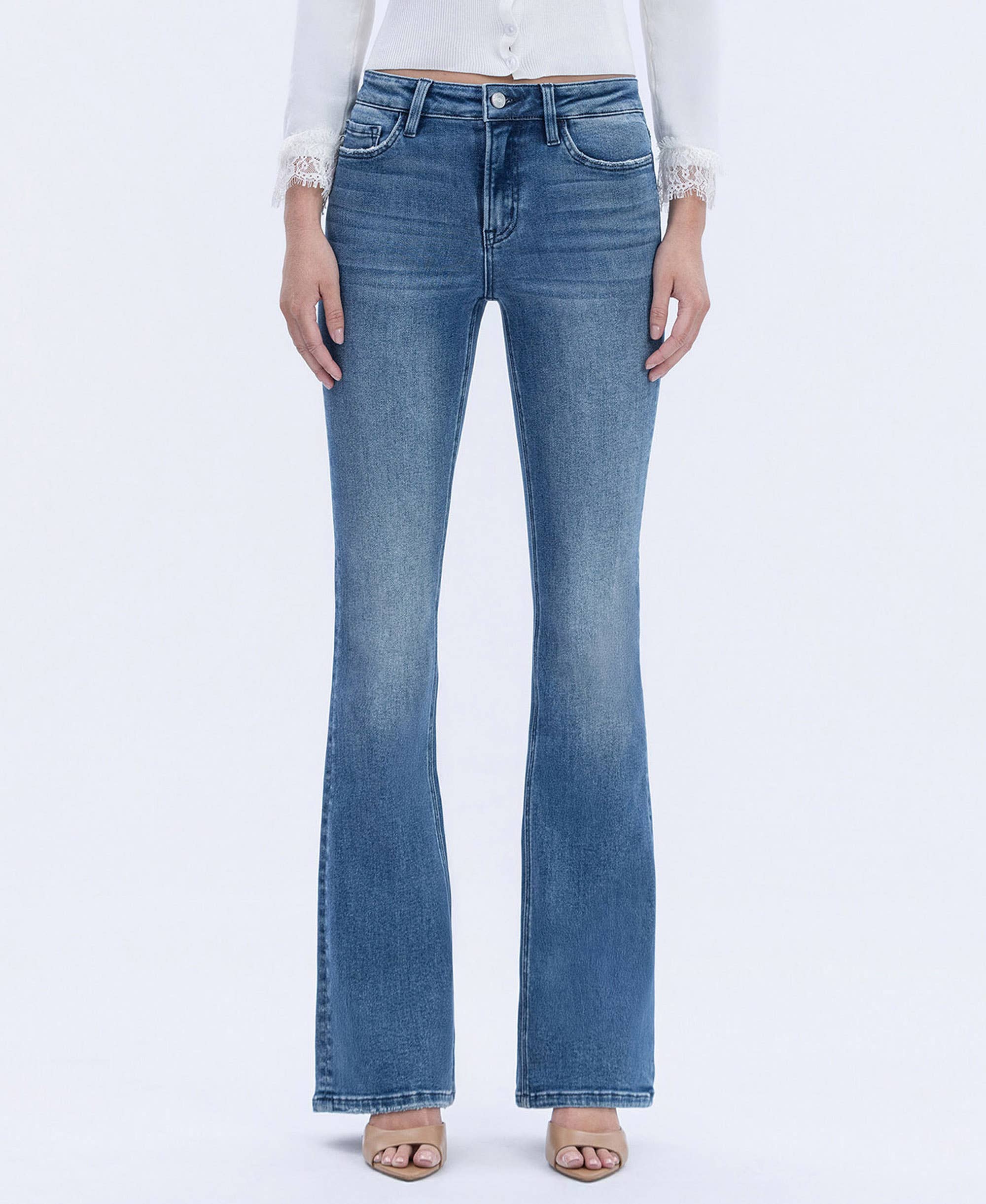 HIGH RISE FULL LENGTH BOOTCUT JEANS COMFORT STRETCH DENIM, HIGH RISE WAIST, FINISHED HEM, FULL LENGTH, BOOTCUT JEANS F. RISE: 10" / INSEAM: 33" / LEG OPENING: 18 1/2" MODEL IS 5'10" WEARING A SIZE 26