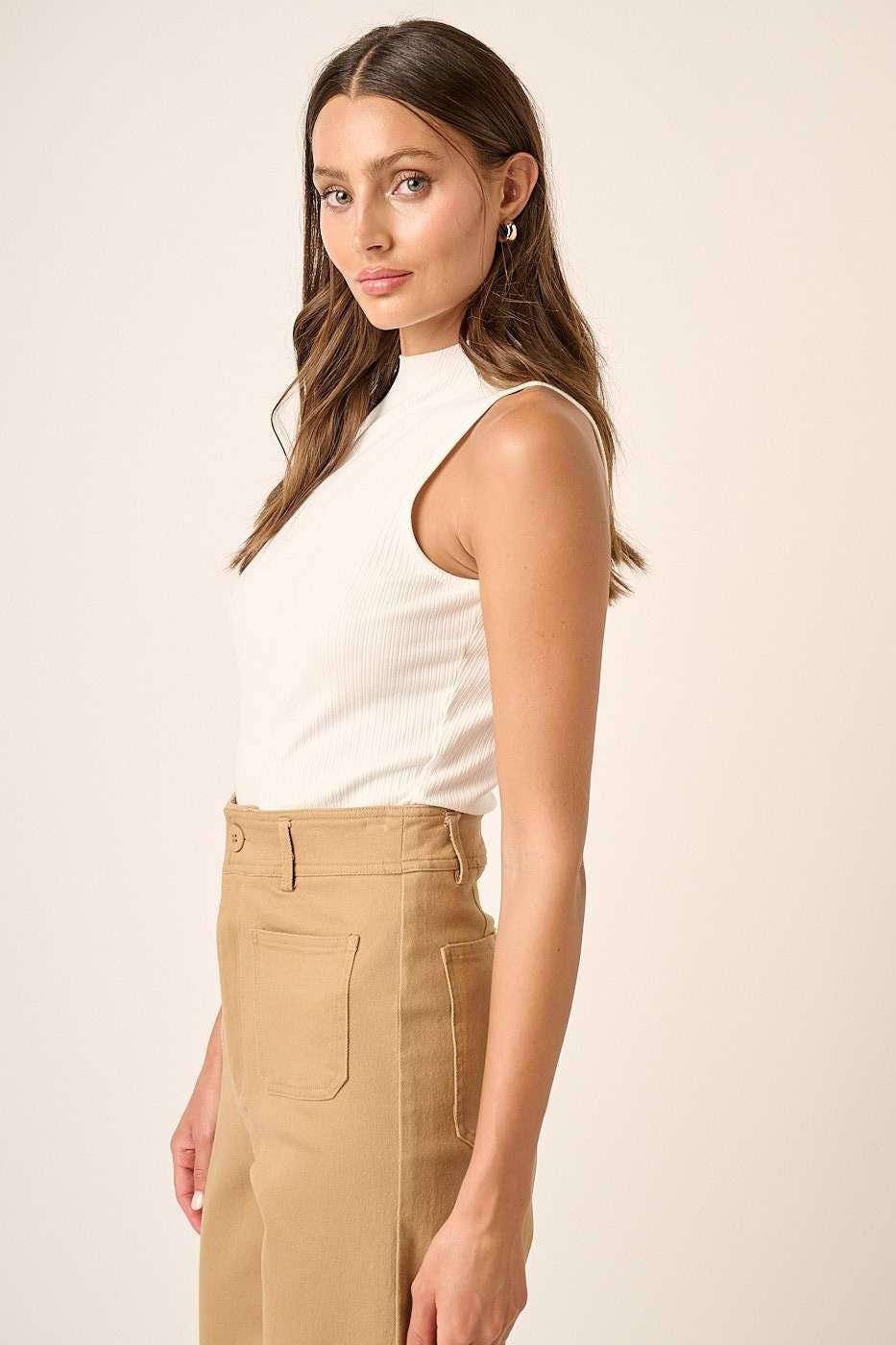 Simple, elevated, and endlessly versatile — Eliza is the ribbed mock neck tank your wardrobe has been missing. Designed in a soft rib knit fabric, this sleeveless top features a modern mock neckline with raw cut-edge detailing for an effortless, slightly edgy finish. The straight hemline and streamlined silhouette make it perfect for layering or wearing on its own. It’s one of those pieces that looks polished but feels easy — a true everyday essential.