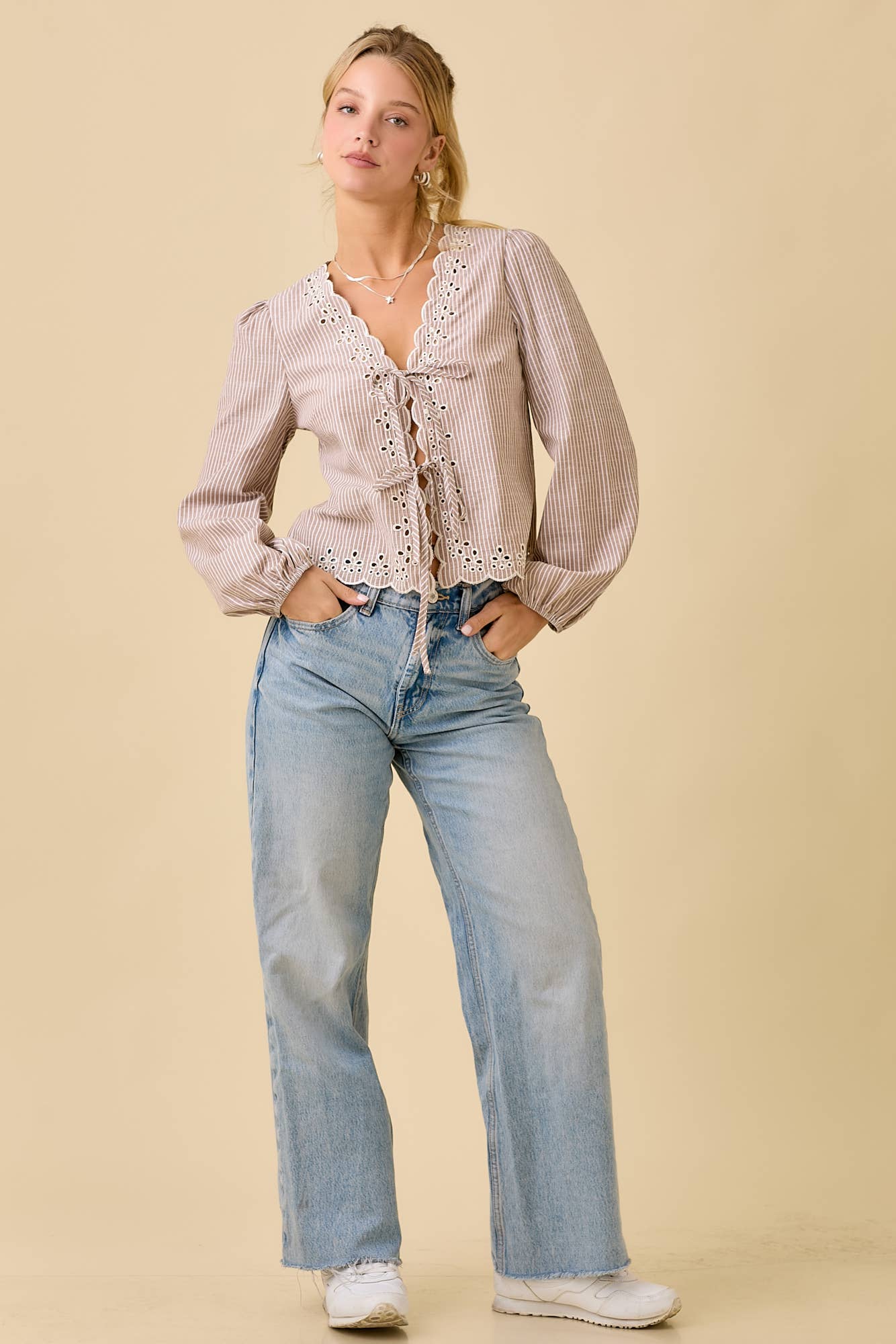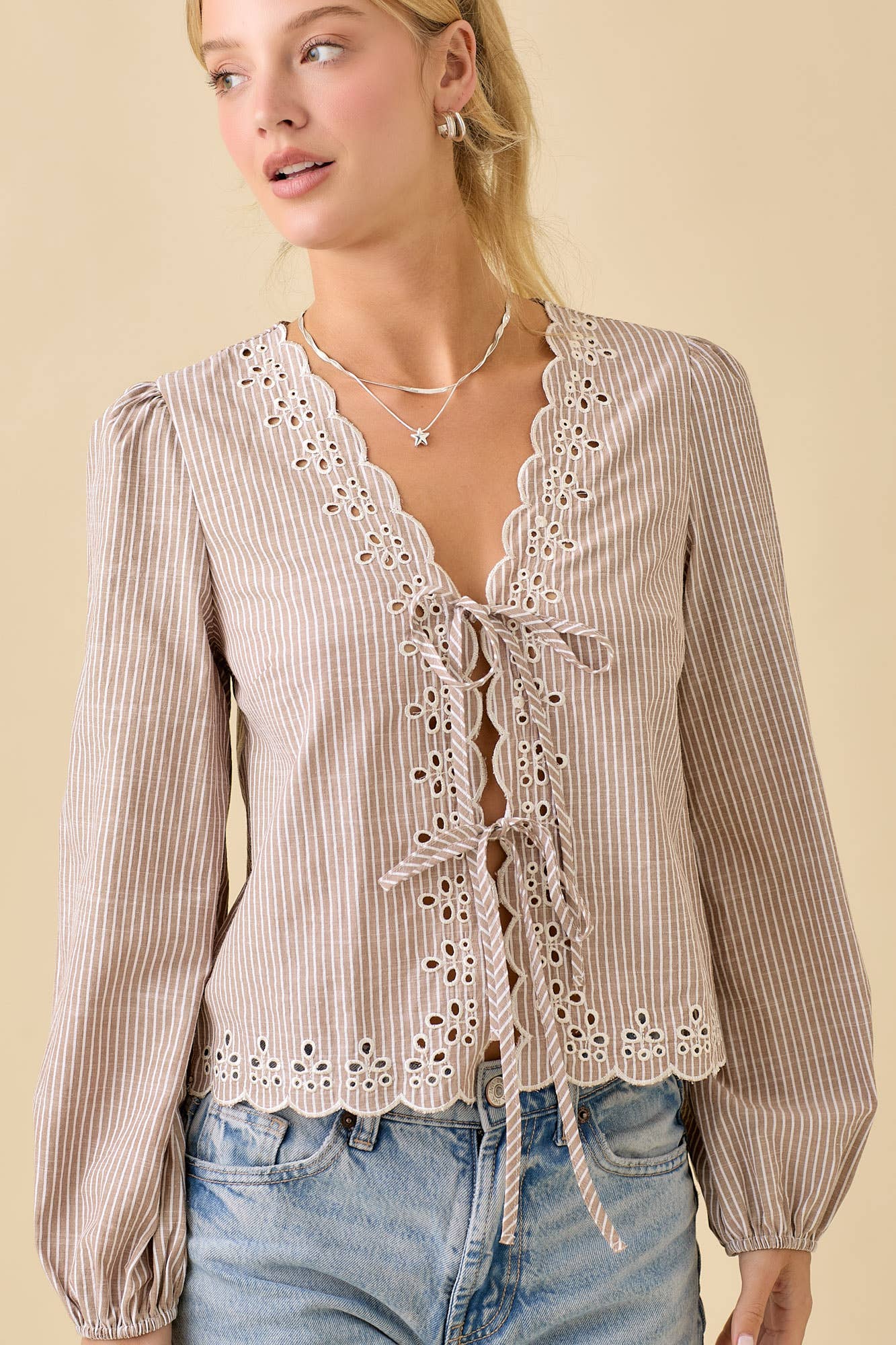 Soft, feminine details and effortless texture come together in the Laurel Embroidered Tie Top. Designed with delicate scallop embroidery, this lightweight blouse adds a romantic touch to your everyday wardrobe.