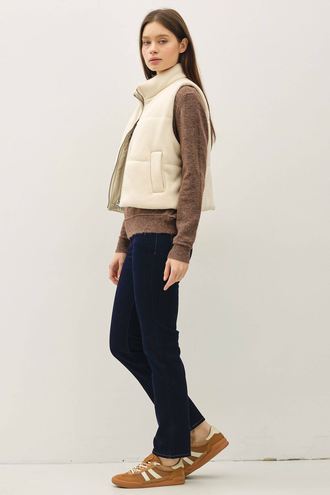 Meet the Hollis Soft-Touch Padded Vest — your new go-to layer for cozy Midwest days. This lightweight, plush vest brings warmth without the bulk, featuring a soft ribbed texture, a high neckline to keep out the wind, and an adjustable hem for the perfect custom fit. Whether you're layering over a chunky sweater or tossing it on with a long sleeve and denim, Hollis gives that effortless, clean look that works all season long.