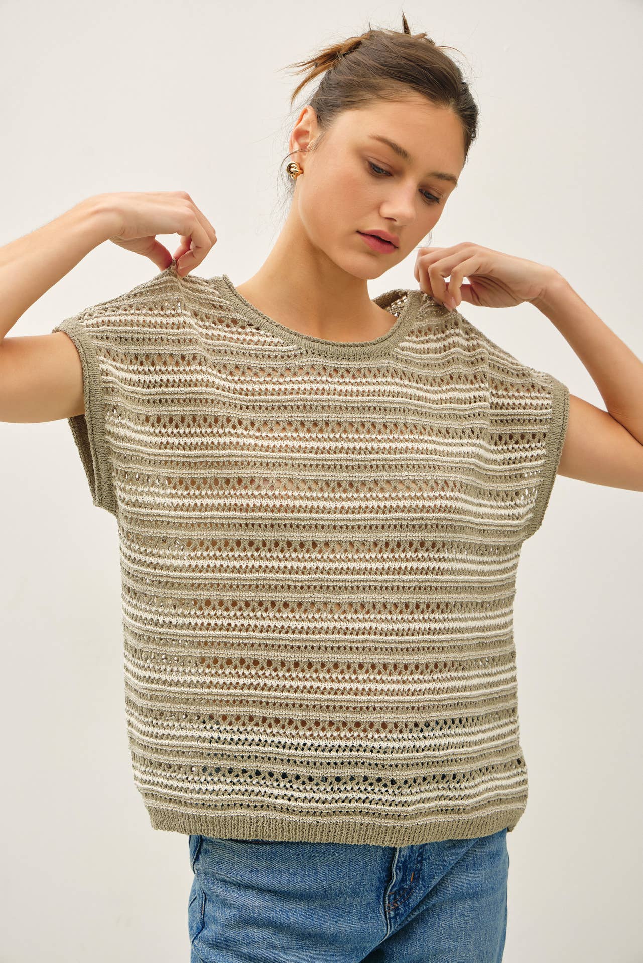 The Alessia Striped Crochet Sweater Top blends thin stripe detailing with an airy crochet knit for a relaxed, effortless silhouette. Designed with a flattering boat neckline and cap sleeves, this oversized sweater top drapes beautifully while staying lightweight and breathable.